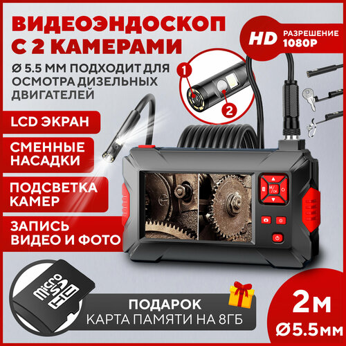 Эндоскоп с экраном и 2 камерами, карта памяти на 8 гб в подарок, диаметр 5.5 мм, длина 2 м