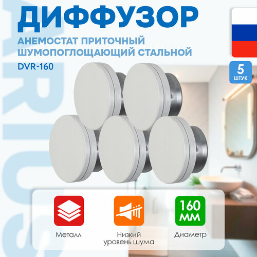 Комплект 5 шт. Диффузор/Анемостат приточный шумоподавляющий стальной ARIUS DVR-160 (арт. 135565), 160 мм, RAL 9016