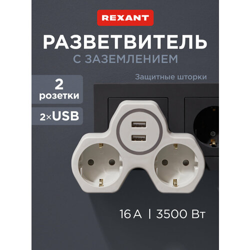 Двойник электрический REXANT 16 А с заземлением и защитными шторками + 2 USB, 2,4 А