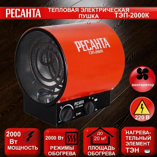2000 ВтТепловая электрическая пушка РЕСАНТА ТЭПК-2000 предназначена для вентиляции и обогрева жилых и производственных помещений, складов, гаражей, а также для обогрева и сушки в строительстве.