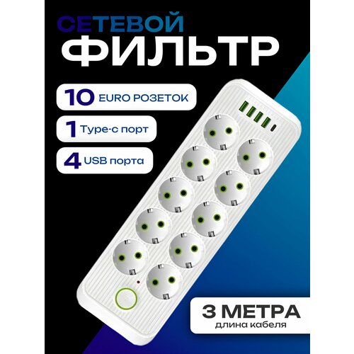 Сетевой фильтр 10 розеток 4 USB и 1 TYPE-C, удлинитель с выключателем на корпусе, длина 3 метра
