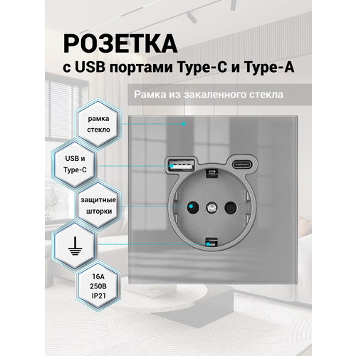 Розетка одинарная с USB и type-C входами, 1 пост рамка закаленное стекло 82mm*82mm,. F8