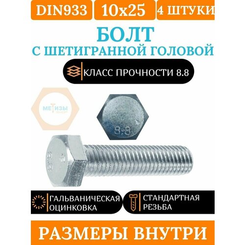 DIN933 10х25 болт оцинкованный, кл. пр. 8.8, 4 шт.