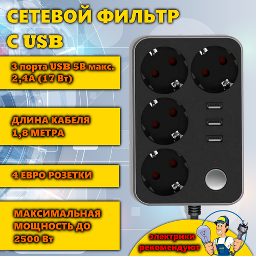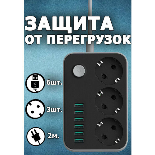 черныйУдлинитель, сетевой фильтр с 3-мя или 4-мя EURO розетками, 4-мя или 2-мя USB портами и type-C портом. Длина шнура 3м. Удлинитель сетевой предназначен для бытового использования, для питания ПК, ноутбука, смартфона, бытовых кухонных приборов. Тройник имеет пониженный нагрев, высокий уровень безопасности. Технические характеристики розетки: Номинальный ток сетевого фильтра с предохранителем: 10 А Номинальное напряжение фильтр сетевой: 250 В. Номинальная мощность удлиннителя: 2500 Вт USB-порт: 4 или 2 на выбор. Выход USB: 5В 2.1 А (Auto Max) Вход 250В - 50Hz 200мА. Материал корпуса: пластик АВС. Пожаробезопасный корпус: да. Удлинитель usb, тройник с USB удобен для ускоренной зарядки смартфонов, телефонов, фонарей и др. электротехники. Тройник розетка с портом TYPE-C пригодится для зарядки современных электроприборов с универсальным штекером type c. Удлинитель черный имеет внешнюю фактуру материала с узором под карбон, usb удлинитель смотрится модно и современно. Тройник с выключателем имеет возможность выключени