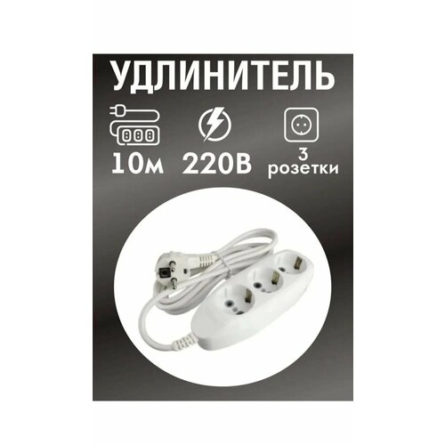 Удлинитель 3 розетки, 10 м, 10 А, 2200 Вт, ПВС 3х0.75 мм2, с з/к, белый