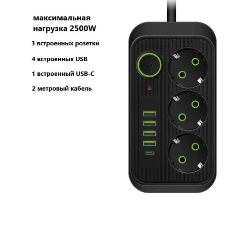 Сетевой фильтр со смарт USB зарядкой, 3 розетки 4 USB +1 Type-C, 2m. чёрный