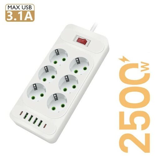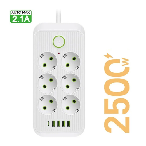 Сетевой фильтр со смарт USB зарядкой, 6 розетки 4 USB +1 Type-C, 2m