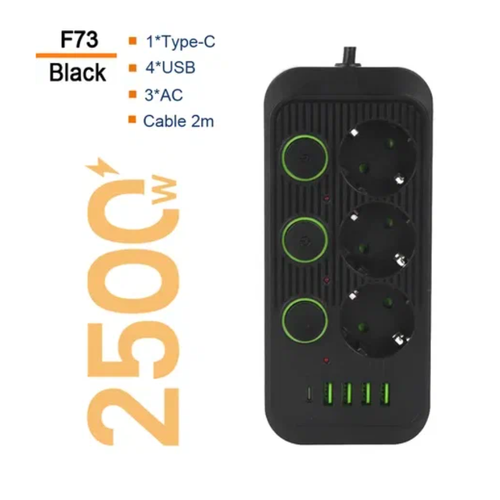 Сетевой фильтр со смарт USB зарядкой, 3 розетки 4 USB +1 Type-C. 2m. Черный
