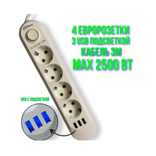 Удлинитель сетевой фильтр 3 метров 4 розетки + 3 USB EU