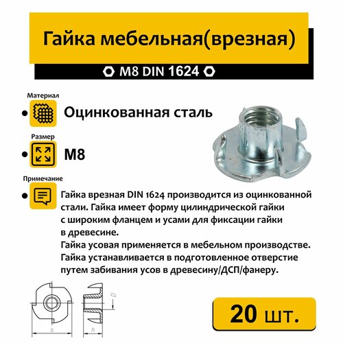 Гайка врезная / мебельная М8 цинк, 20 шт.