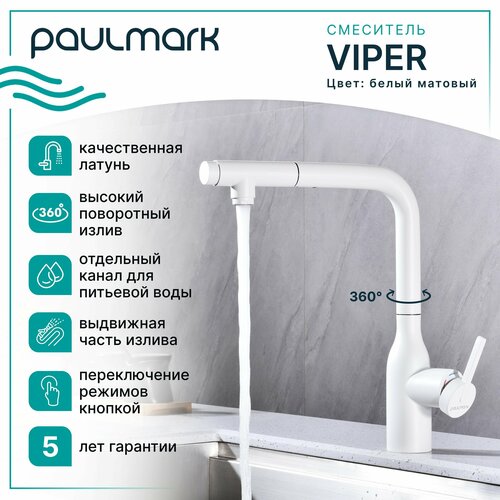 Смеситель для кухни с гибким выдвижным изливом Paulmark-Starke VIPER, подключение к системе фильтрации воды (отдельный канал), латунь, на мойку / столешницу, матовый, Vi213105-431
