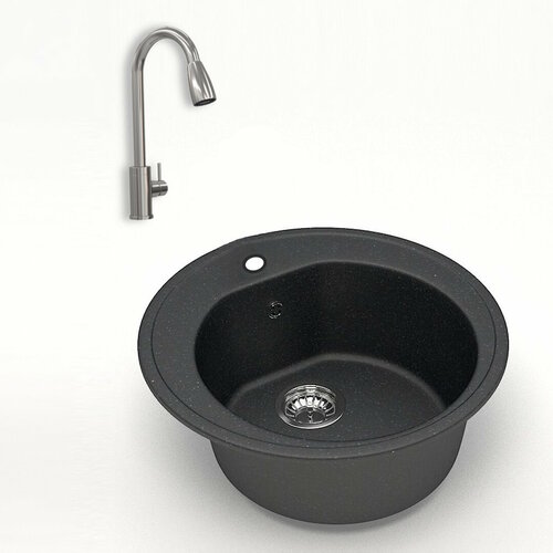 Комплект Teymi 2 в 1 для кухни: мойка Lina D51, круглая, черная матовая + смеситель для кухни Lori с выдвижным изливом, глянцевый хром F01496
