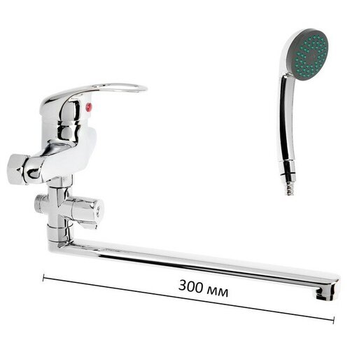 300Однорычажный пристенный смеситель для ванны с ручкой поворотного типа из цинкового сплава с отверстием на рычаге имеет плоский поворотный излив из нержавеющей стали. Изделие оснащено качественным аэратором с пластиковым сердечником типа Бенц. Картридж металлокерамический. Комплект пристенного крепления включает в себя уплотнительные прокладки, эксцентрики и глубокие хромированные чашки отражателей. Дивертор (переключатель) с излива на душ - наружный, штокового типа. поворотного типа держатель лейки, лейка и шланг для душа.
