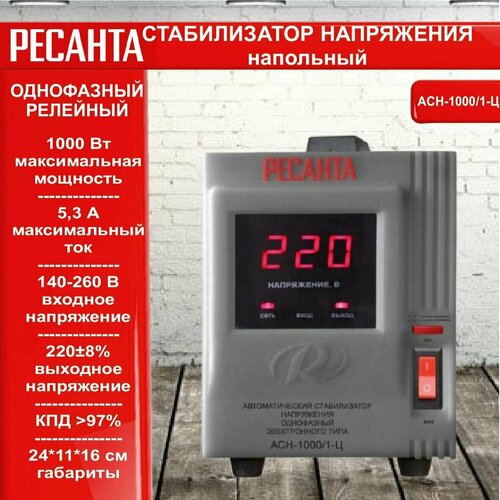 Стабилизатор напряжения однофазный РЕСАНТА АСН-1 000/1-Ц напольный ** 1кВт; входное напряжение 140-260 В; 5,3А; 1 розетка; LED-дисплей