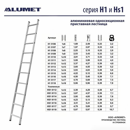 Алюминиевая приставная односекционная лестница Алюмет H1 5112, максимальная нагрузка 150 кг.