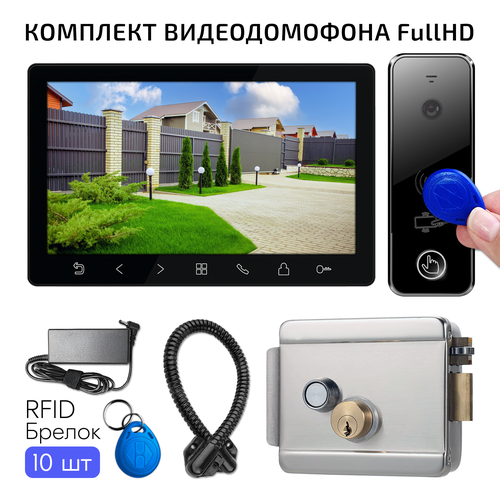 Комплект видеодомофона для дома FullHD, цветной монитор 7 дюймов и вызывная панель со встроенным считывателем, Черный