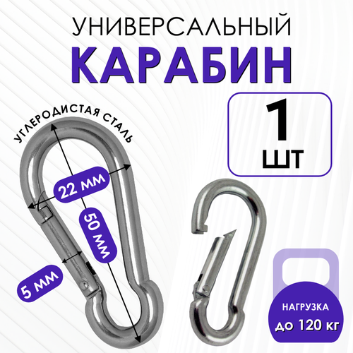 Карабин монтажный усиленный стальной пожарный универсальный 5х50 мм для туризма, похода и снаряжения 1 штука