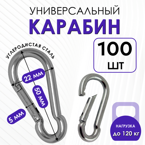 Карабин монтажный усиленный стальной пожарный универсальный 5х50 мм для туризма, похода и снаряжения 100 штук