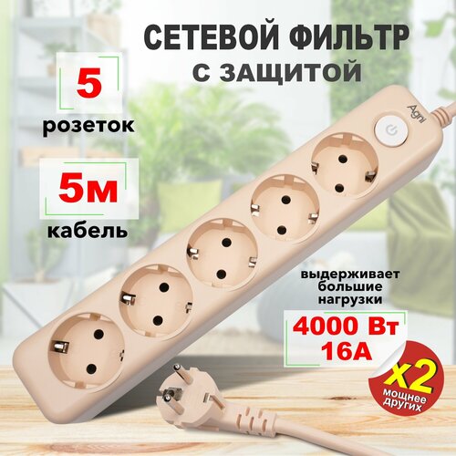 Сетевой фильтр с заземлением на 5 розеток AGNI с выключателем, защитные шторки, 4000 Вт/16 А, удлинитель 2 метра