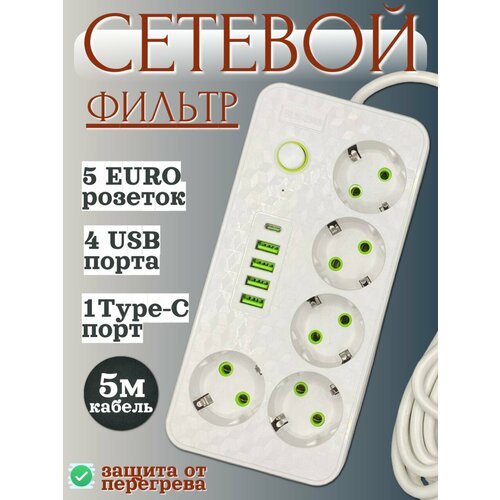 Сетевой фильтр удлинитель с 4 USB и 1 Type-C, 5 розеток, с выключателем, 5 метра от Impulse_Store