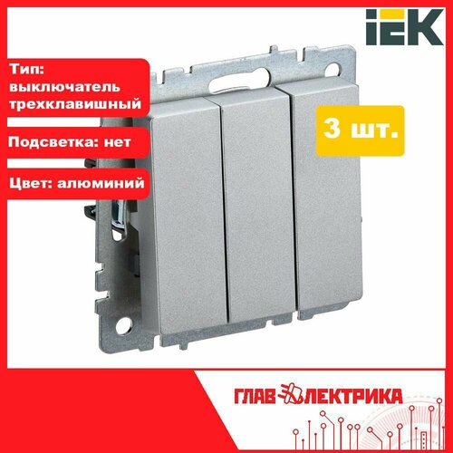 Выключатель трехклавишный IEK Brite, алюминий, без подсветки, IP20, BR-V30-0-10-K47 / Выключатель скрытый (встраиваемый) Иэк Брайт, комплект 3 шт.
