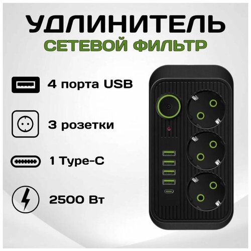 Сетевой фильтр 3 метра с 3 розетками 4 USB +1 Type-C 2500 Вт (удлинитель, адаптер для зарядки, пилот, тройник), с предохранителем и заземлением