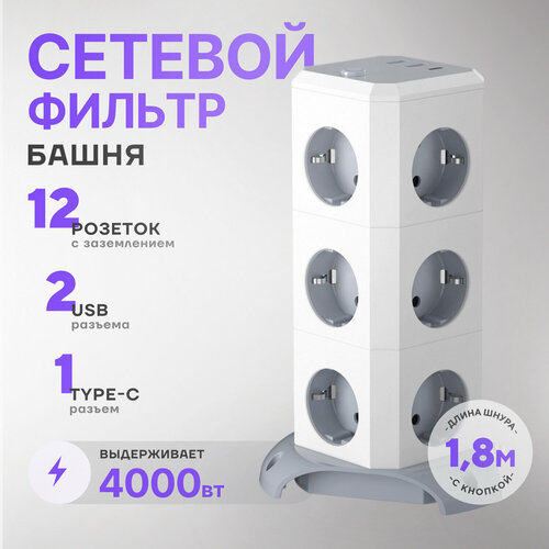 Сетевой фильтр электрический башня 12 розеток, usb, typeC