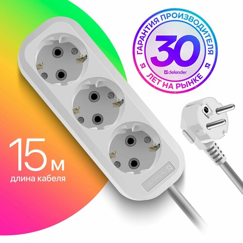 Удлинитель сетевой Defender 3 розетки с заземлением , 15 м , 16А
