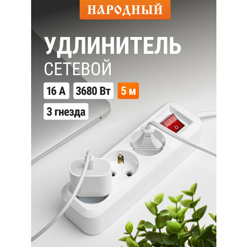 Удлинитель сетевой 3 розетки, 3 метра, с заземлением, с выключателем, 16 А, 3680 Вт, Народный