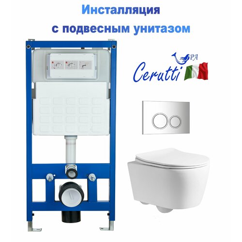 Комплект 4 в 1 инсталляция с подвесным унитазом Cerutti SPA Sella PP, сиденье микролифт, кнопка смыва хром (CR556+CT9738+CR05CH)
