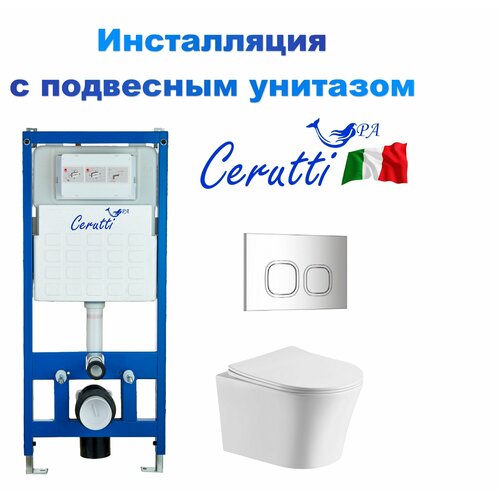 Комплект 4 в 1 инсталляция с подвесным унитазом Cerutti SPA Sella Aria, сиденье микролифт, кнопка смыва хром (CR556+CT7183+CR05CH)