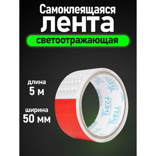 Светоотражающая/сигнальная лента Vell, бело-красная RT, в полоску, 50 мм х 5 м (1376513)