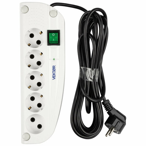 Сетевой фильтр VEKTOR Lite, 5 розеток, б/з, 10А / 2200 Вт 1.8 м 250 мм 100 мм 70 мм 5