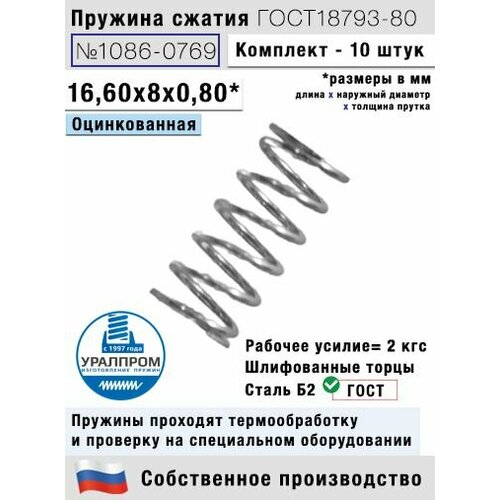 Пружина сжатия 1086-0769, L 16,60 мм; d 0,80 мм; D 8 мм ГОСТ 18793-80 (комплект 10 штук)