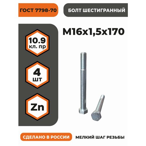 Болт М16х1,5х170 ГОСТ 7798-70 (DIN 960) кл. пр. 10.9 в цинке, высокопрочный, мелкая резьба, уп. - 4 шт.
