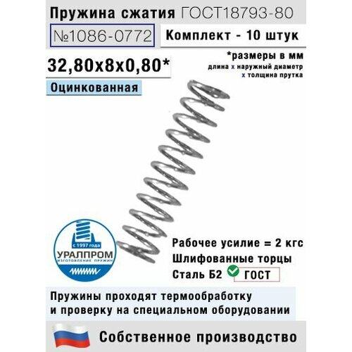 Пружина сжатия 1086-0772, L 32,00 мм; d 0,80 мм; D 8 мм ГОСТ 18793-80 (комплект 10 штук)