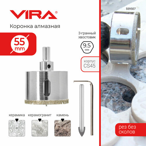 Коронка алмазная 55 мм по керамограниту и керамике трехгранный хвостовик VIRA