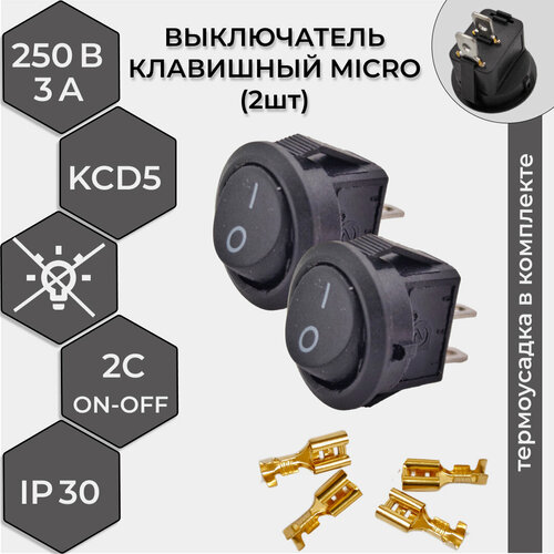 Выключатель клавишный MICRO круглый 250V 3А (2с) ON-OFF комплект 2 шт, (+ клеммы и термоусадка)