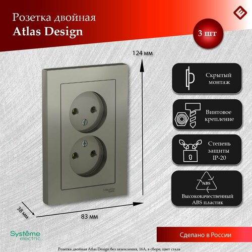 Розетка двойная сталь, без заземления,16А, в сборе, Schneider Electric AtlasDesign (комплект 3шт)