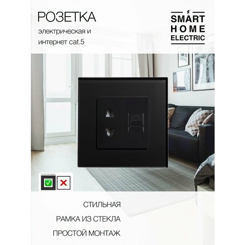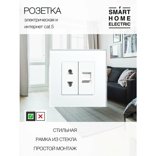 Розетка, рамка из стекла, 1 пост (Интернет RJ-45 + евровилка)