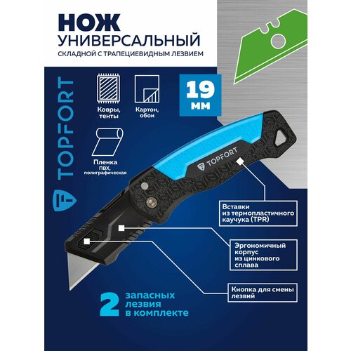 Нож строительный складной, TOPFORT, ширина лезвия 19 мм + 2 запасных лезвия