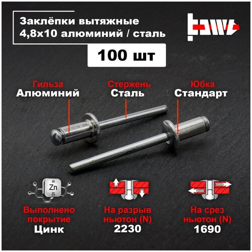 Заклёпки вытяжные, для заклёпочника, алюминиевые 4,8х10 100 шт