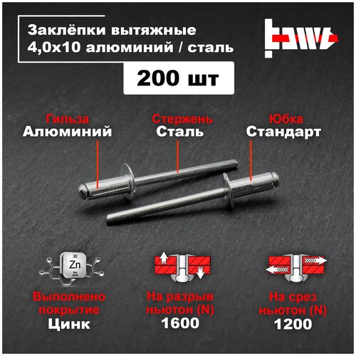 Заклёпки вытяжные, для заклёпочника, алюминиевые 4,0х10 200 шт