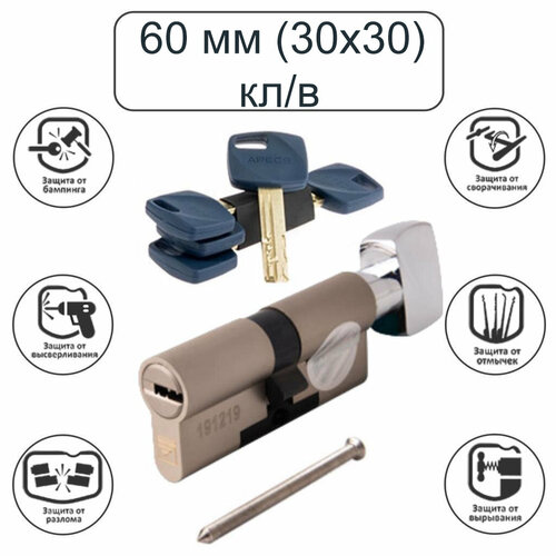 Цилиндровый механизм Apecs (Апекс) Premier XR 70 мм (30x30В) кл/в, взломостойкий цилиндр, личинка для замка