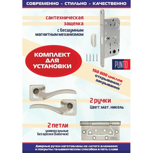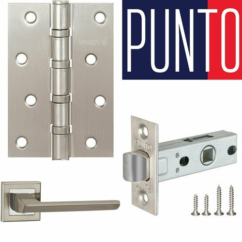 Комплект дверных межкомнатных ручек PUNTO с защелкой и врезными универсальными петлями, матовый никель/хром