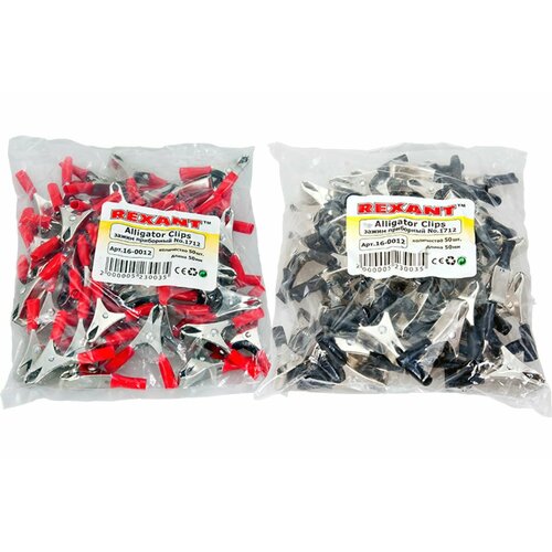 Зажим крокодил REXANT, длина 50 мм, ток 10A, 2 шт красный, черный