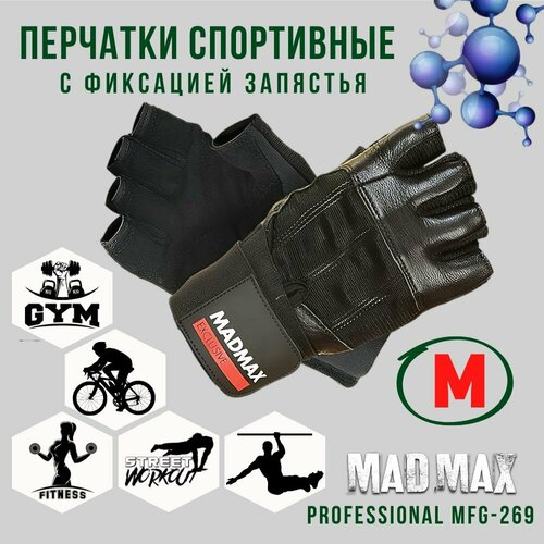 Перчатки кожаные мужские с фиксацией запястья MadMax Professional MFG-269 Black, Размер M - Для фитнеса, тяжелой атлетики, воркаута, кроссфита, велоспорта, из натуральной кожи (арт.2418)