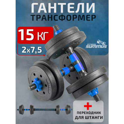 Набор пластиковых разборных гантелей Summus 2 в 1 с коннектором для штанги 2 шт. по 7,5 кг для тренировок дома и в зале, d-25мм, арт. 600-008-blue