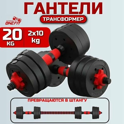 Штанга спортивная 20 кг или гантели разборные OneFit, 2 шт по 10 кг, с коннектором для штанги, 701-002