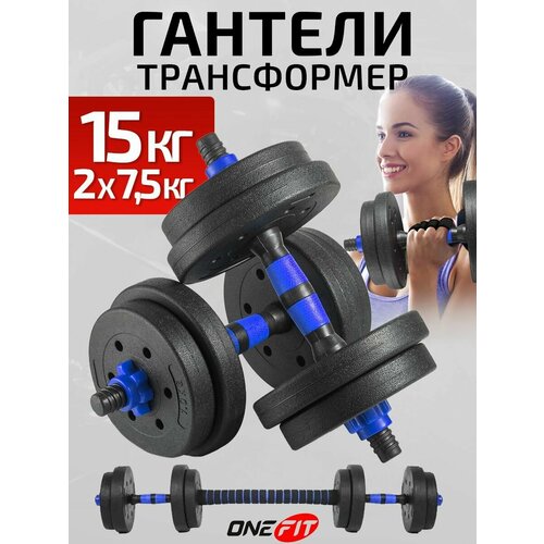 Гантели разборные OneFit, 2 шт по 7,5 кг, пластиковые с коннектором для штанги, шершавые, 701-001-blue